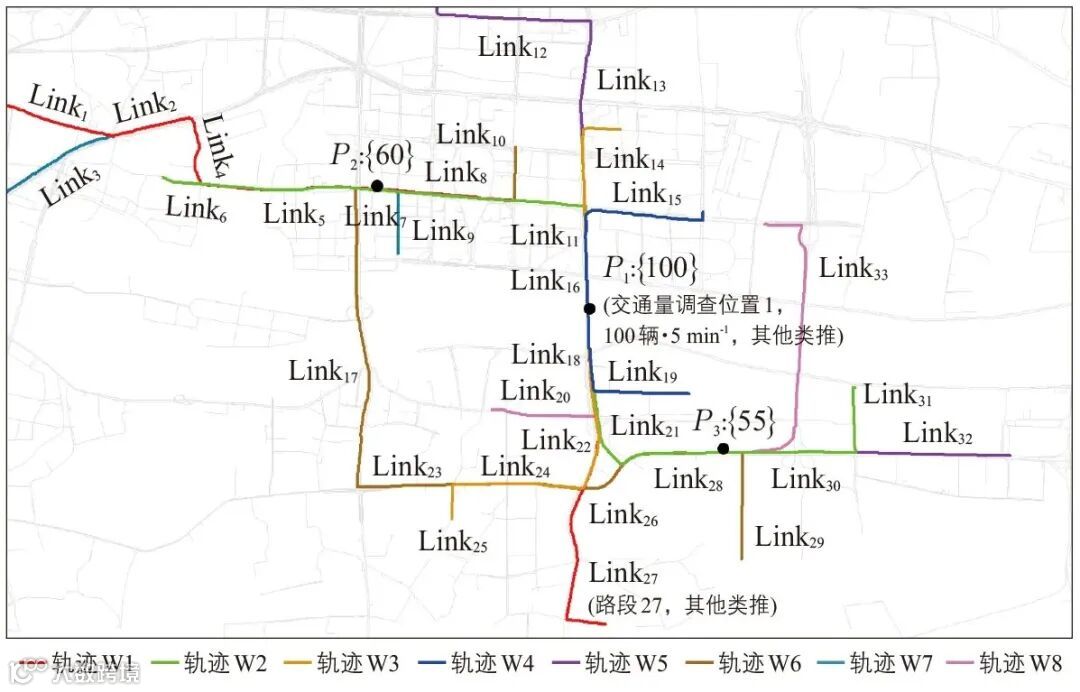 以交通规划的基础指标道路交通量为例,针对现有交通量调查准确度高但无法实现全路网覆盖、道路卡口数据覆盖率高但准确度不足的问题,文献[16]提出一种传统调查数据和轨迹数据融合的交通量分配方法(见图5)。通过路网预处理、轨迹处理和集合构建、调查位置与轨迹空间关系匹配、调查位置的剩余交通量计算等步骤,对调查位置数据和运营车辆轨迹数据进行融合匹配,推测从独立调查点位扩展至全路网的全对象交通量,形成“总量—结构”数据联动的道路交通量融合分析方法。以广州市持续20余年约300处人工道路断面交通量调查数据的基础,结合5 000多处道路卡口数据,决策支持平台推测形成覆盖市域次干路及以上道路的全路网现状交通量;根据交通影响评估、交通专项规划等编制调查中的百余条路段验证,决策支持平台所推算的交通量与实际调查交通量偏差为20%以内,涵盖路段数量占比为79.1%。