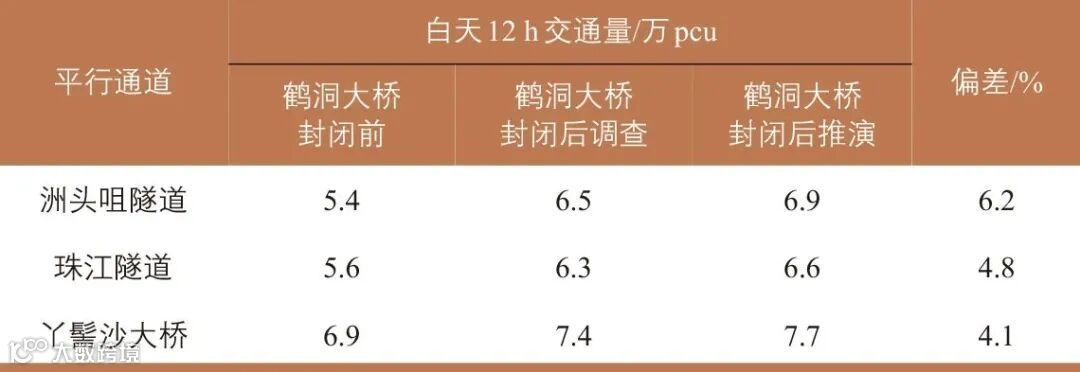 表1 广州鹤洞大桥平行通道交通量推演与调查对比