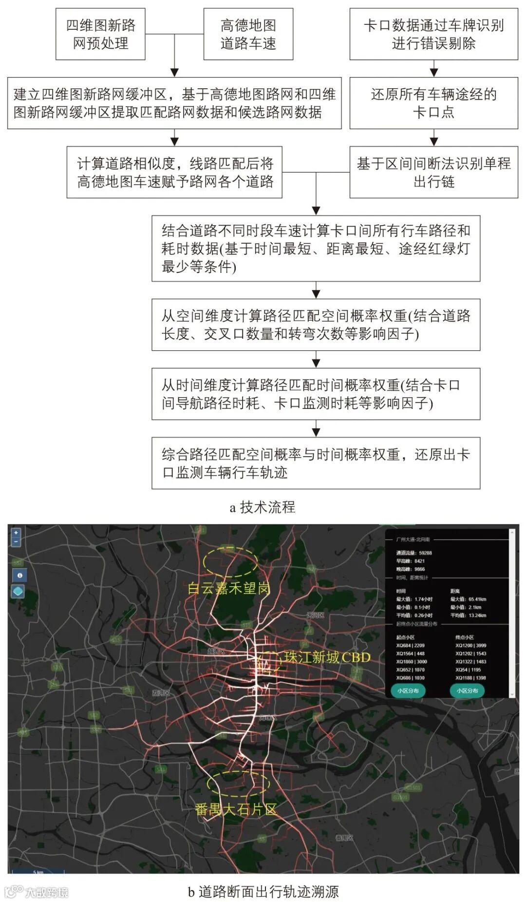 小汽车、公共交通、步行和非机动车交通等客流的出行轨迹溯源是交通运行规律再挖掘的基础性要素,也是传统交通规划模型升级的关键抓手。以小汽车轨迹溯源为例,文献[17]提出基于时空相似度的车辆轨迹推算方法(见图6)。该方法基于基础路网和高德地图车速构建导航级地图,围绕时间最短、距离最短、途经红绿灯最少等条件计算卡口间的多条可能出行路径,形成出行路径集合。在空间维度上结合道路长度、道路交叉口数量和转弯次数等影响因子,计算路径匹配空间概率权重;在时间维度上结合卡口间导航路径时耗、卡口监测时耗等影响因子,计算路径匹配时间概率权重,综合路径匹配空间概率与时间概率权重,还原出卡口监测车辆行车轨迹,用于分析主要通道的车辆出行距离、时间以及来源空间分布。以广州市南北向重要交通性主干路广州大道(二沙岛断面)为例,高峰时段途经该断面的车辆最长出行距离和时间分别约为65 km和1.7 h,平均约为13 km和0.3 h,起终点主要为珠江新城CBD及周边,外围区的白云嘉禾望岗、番禺大石片区等。建议加快同走廊的市域轨道交通快线26号线建设,构建南北向复合城市交通廊道,提高对存量需求的适配性。
