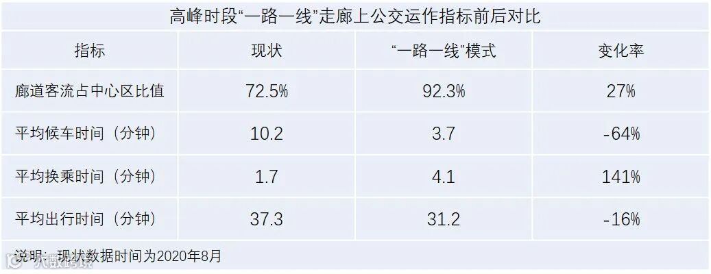 乘客角度。中心城区高峰时段全网换乘系数从1.08增加至1.42,乘客平均候车时间减少30%,全程出行时间缩短13%。具体到“一路一线”走廊,前后对比就更加明显,平均候车时间减少64%。