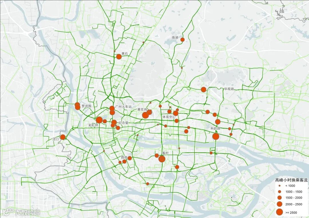 城市角度。该模式有助于塑造新的地面公交TOD模式。通过构造新的换乘节点,用相对(地铁)较小的成本推动空间重构形成第二套TOD系统,达到集约化发展的目的。在新模式下,换乘点主要分布在核心区向外的各大廊道上:西方向的滘口、罗冲围等;北方向的黄石、南湖等;东方向的华观路、科韵路等;南方向比想象中更贴近市中心,分布在昌岗、客村等站。此外,彩虹桥、广州火车站、纪念堂、体育中心等也都是大型换乘枢纽,具备不错的客流基础。当然,要想真正形成换乘枢纽,技术上需要克服如何将传统以车辆转换为目的的交叉口通过场地改造成以行人为主的场所中心。