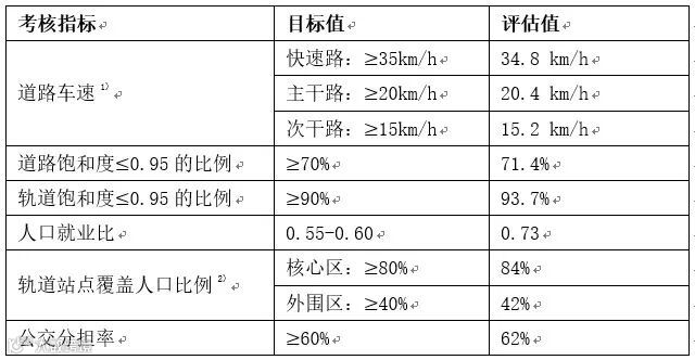 随着轨道分担率提高及道路设施的建设,核心区道路拥挤恶化状况得到遏制,路网平均车速基本与现状一致,高峰期轨道及道路拥堵路段比例降低,基本达到考核目标。