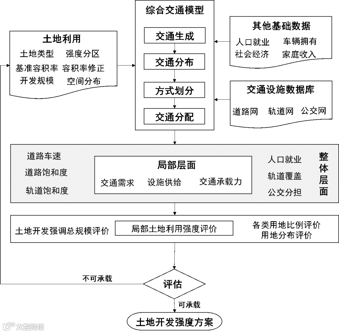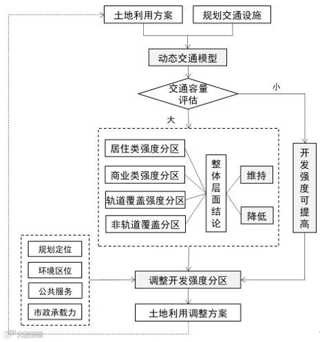 开发强度分区阶段是针对全市整体层面的研究,应利用动态模型分配法进行交通设施容量评估。本文重点对评估体系包括技术路线、评估模型、评估指标等进行细化分析,并根据评估结果对土地利用提出反馈建议。