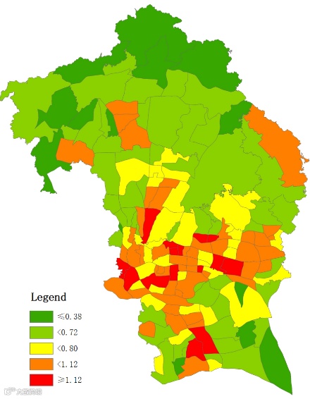 由于交通与土地利用要进行多轮反馈,初次由控规到强度分区过程中,先通过交通设施容量评估筛选出急需调整强度的单元,假设为评估值最高、最低各10%的评估单元,对应的S值分别为1.12和0.38。