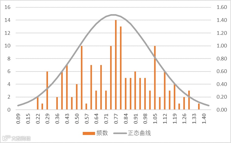 局部层面结合广州市交通模型小区和评估单元划分原则,将研究范围划分为160个评估单元。利用1.4所述方法计算各评估单元交通设施容量S,经统计分析,S数值符合正态分布特征(见图3),其总体均值置信度95%的置信区间为[0.72,0.80]。