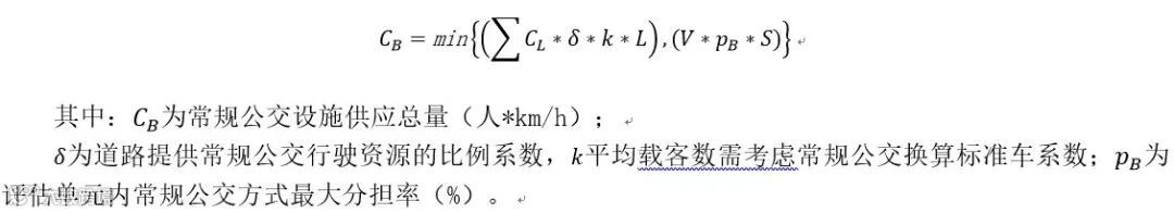 常规公交设施供应量与公交站点的数量,停靠公交站点的线路数量和每条线路的班次数量、公交线路长度等相关,对于现状公交线路比较成熟的地区可采用通行能力汇总法。对于新规划片区,由于公交线路和站点无法预知,通常通过规划道路设施提供给常规公交的资源能力进行计算,同时受常规公交承担比例约束。