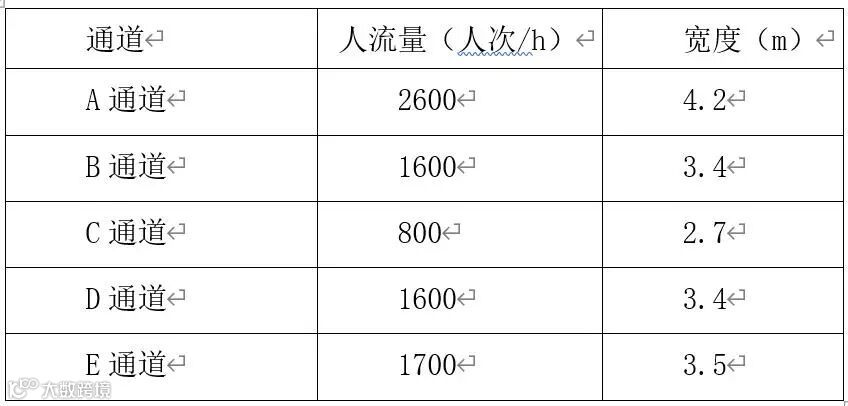 依据《道路通行能力手册》,将行人通道服务水平分为A、B、C、D、E、F六级(如表)。根据服务水平标准反推,得到服务水平为A级、B级和C级情况下行人通道能力分别为小于1200、1600、2000人次/h。参考道路交通规划规范和设计条例,以及日本关于地下步行通道的宽度公式[注6]: