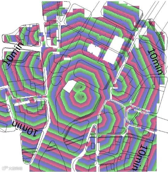再通过GIS软件运算明确地铁站步行可达范围的地块,以交通出行方式分析、职住平衡指数等权重,确定规划各地块出行人口比重和潜在人流量。