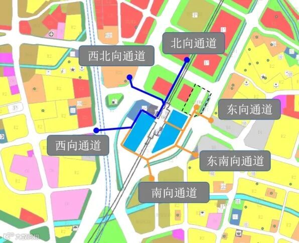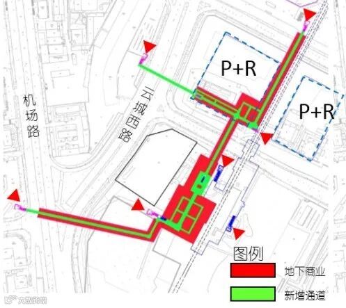 改善轨道站点周边慢行环境,主要构建地下步行走廊系统,通过北向通道、西北向通道、西向通道三个方向地下步行廊道的构建将北部商务商业区和西部棠景片区与轨道站点串联,一方面保障机动车交通和人行交通的连续流,避免人车交通干扰,另一方面加强站点可达性,提高区域轨道交通分担比例。