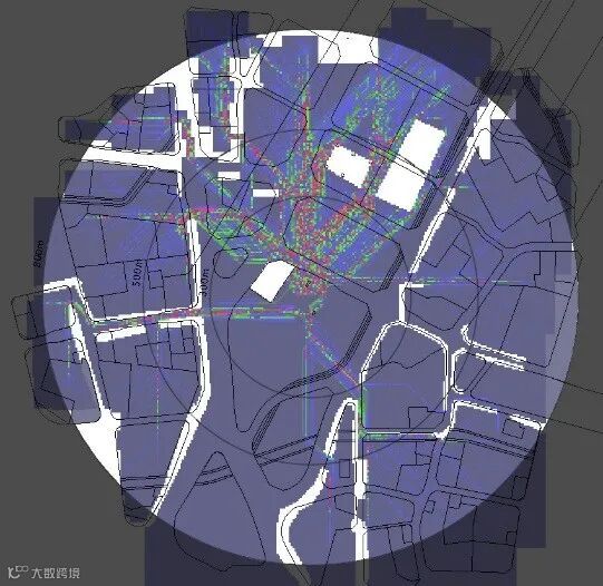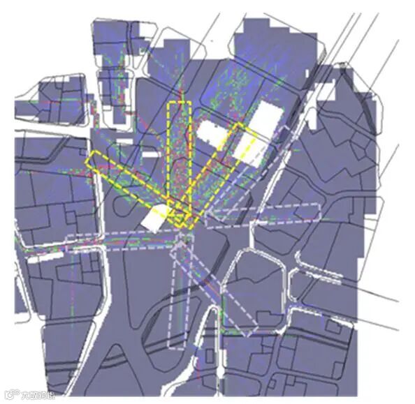 因无障碍状态下行人流可快速穿行道路和地块,由图所示,构成了“米字型”的流线轨迹,其中主要人流来自北部和东北部、西部三个方向,以此判定模拟的步行轨迹作为重点规划的步行廊道。