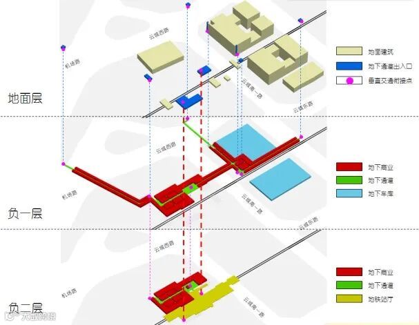 根据以流定性和以流定量方法确定步行廊道空间的方向和宽度,进行地下空间的详细城市设计。形态方案考虑地下空间使人的辨识方向能力变弱,必须以清晰的标志物和简洁的路线为导向,思考以加强地下空间方向感、可识别性为出发点,通过“下沉式广场+线性地下空间”的组合使用,满足人的导向和识别需求。方案设置一纵两横的线性地下步行廊道,通过一条贯通南北向的步行通廊,北部连接万达广场,南部连接飞翔公园腹地;通过设置两条东西向步行通廊,北侧通廊衔接云城西路两侧,南侧通廊衔接机场路和云城西路的交叉节点两侧。另外结合地上空间需求增设七个地下空间出入口,满足站点周边多方向多层次通行的需求。