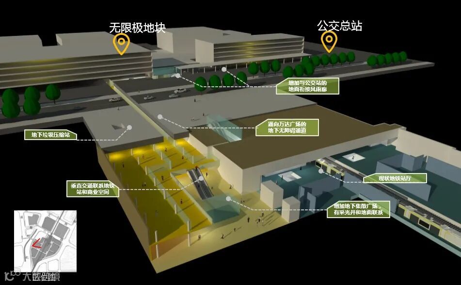 规划重点以地铁站点C出口为依托改造增设下沉广场,满足地下空间识别和逃生需求,同时形成人流集散场地,构建集中式的商业广场和公共服务空间,从而提升地铁站的公共活力和地铁地下空间的商业价值。