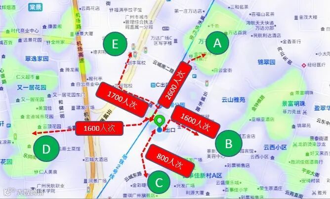 通过现场踏勘分析现实状态下飞翔公园站的通达情况,如图所示,各个方向的通达情况如下:(1)东部地块与站点之间需跨云城东路主干道,过街受信号灯控制,等候时间长,过街距离长;(2)西部地块与站点之间受云城西路和机场路两条干道阻隔,需要等待两次信号灯,过街距离过长;(3)北部万达地块与站点之间需跨越两条次干道,地块受到围闭无法穿行。多种原因导致站点周边各个方向的步行交通现状可达性低。