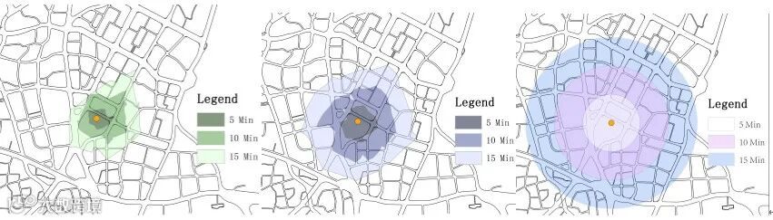 根据仿真数据和GIS的网络分析法,评价飞翔公园站的现状可达性较弱,站点周边15min步行时间所覆盖区域只有77.8公顷,而理想状态15min步行覆盖区域为463.5公顷,现状站点的服务范围与理想状态比较只达到了17%,也就是城市政府需要再投入约5倍的公共交通设施才能满足地区出行的需求,从这次评估可知,仅使用服务半径等常规方法无法真正触及道路和交通设施实际运转中的问题,需要采取精细化的方法对交通空间的不足进行评估和优化。
