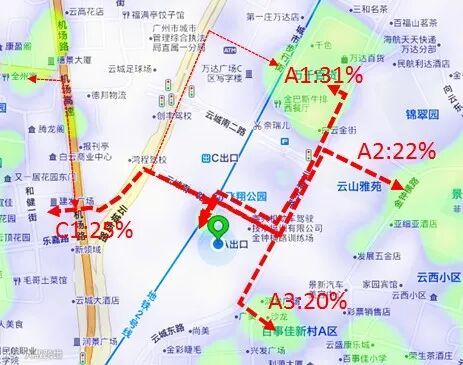根据现场勘查情况,考虑街道的建筑物、围墙、河涌和禁止过街区域等通行障碍,绘制现状行人通行空间。依托现场采样调查,人流方向为往北向万达广场(约31%)、东北向云山雅苑(约22%)、东南向百事佳新村(约20%)、西向机场路(约25%)。