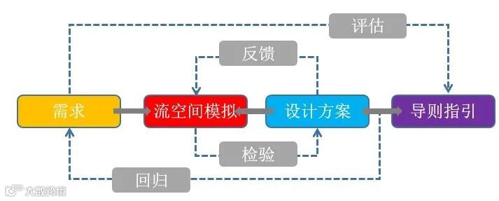 论文试图基于交通预测和模拟,通过building EXODUS软件和GIS对行人流进行分析,揭开城市空间中人活动的实际需求,影响道路和轨道站点等交通空间的流线和空间设计,实现以地铁站为核心的地上地下交通空间一体化设计,达到以人为本、公交引导发展的目标。此外,设计方法并不注重一个结果,而是形成螺旋式上升的循环过程,建立现状流空间模型和规划流空间模型,指导空间形态设计,再通过规划情景模拟推演,找出流动空间的负面影响因素,对空间设计进行评价和反馈,最后达到对需求的回归。