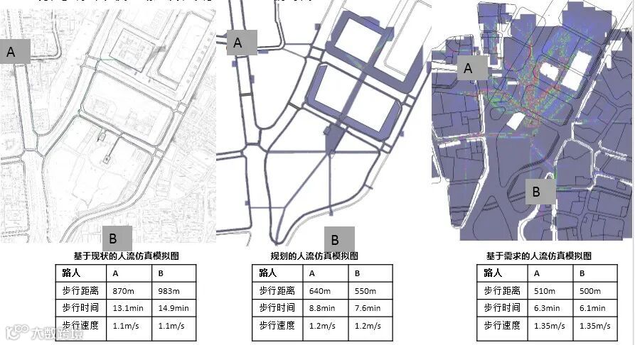论文通过流动空间设计应用重点解决两个问题。第一通过模型仿真建立行人流动线,结合既有条件提出合理化的方案,优化步行空间形态布置;第二通过行人流量化分析,充分考虑行人通行速率和空间感受,控制步行通道的形式和尺寸。