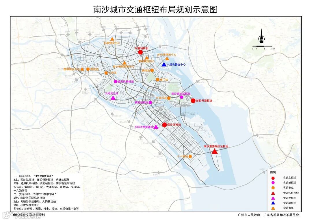 规划建设“3主3辅多节点”客运枢纽体系。3主即南沙站、庆盛站、邮轮母港枢纽,3辅即横沥站、南沙客运站、通用机场,多节点即黄阁站、蕉门站、大涌东站、大岗站、榄核站、十六涌站等;规划打造“1特2主1辅多节点”交通物流枢纽,1特即南沙港国际航运枢纽,2主即万顷沙物流基地、大岗货运站,1辅即小虎岛物流中心,多节点即沙仔岛、黄阁、裕丰、榄核、东涌物流中心等。