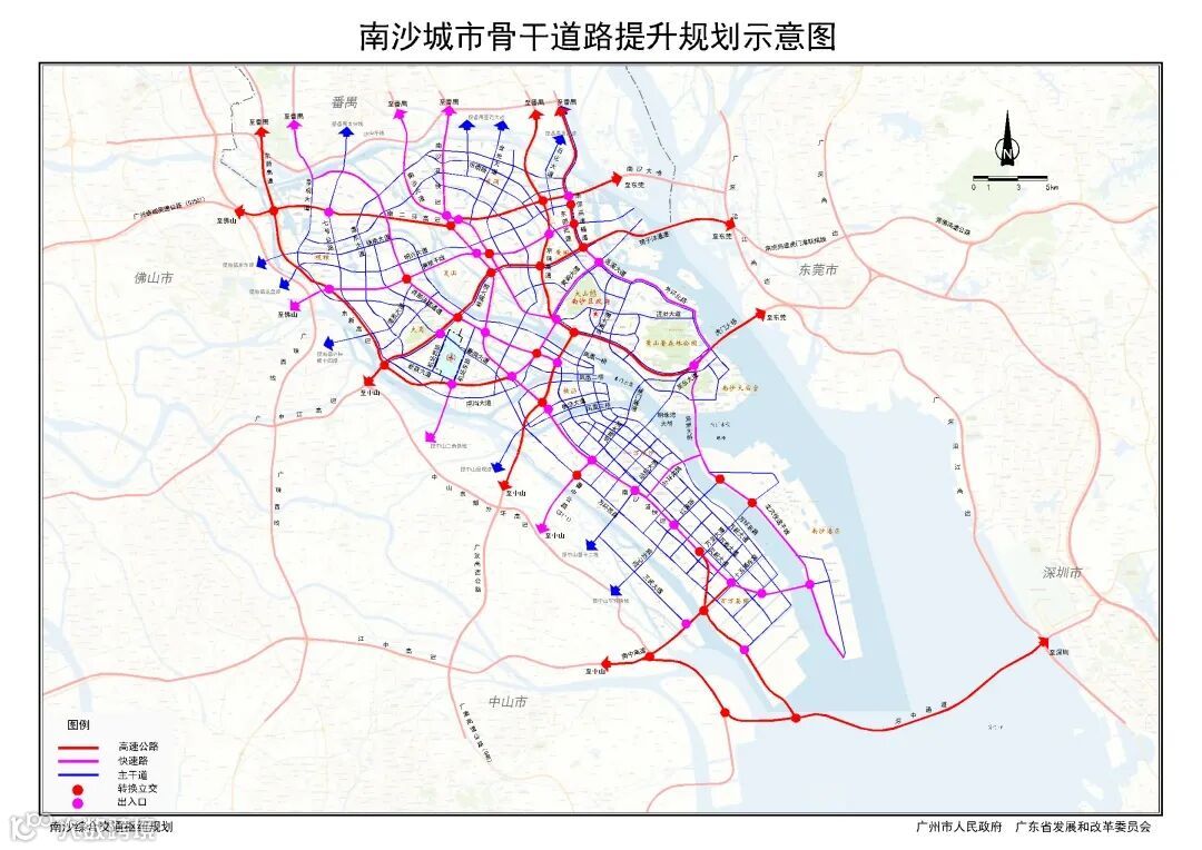 骨干道路规划建设由主干道组成的内环通道及高快速路组成的外环通道,重点建设狮子洋通道等过江通道加密湾区东西岸联系,形成“六横七纵”的高快速路网。
