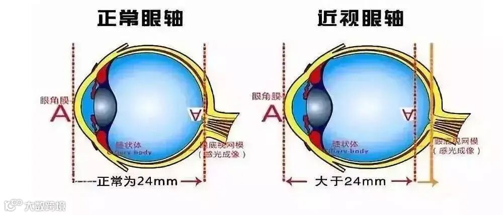 眼球近似于一个球状体,它从前到后的长度叫“眼轴长度”,眼轴过长是导致近视的根本原因之一。因此在近视预测中,始终离不开眼轴长度这个词。正常人的眼轴长度出生约18mm,3岁时约22.8mm,成人约24mm。一般情况下,眼轴每增长1mm,近视度数就会增加250~275度。