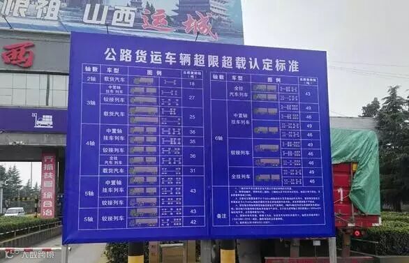 相较山西忻州的纯文字宣传,山西运城高速收费站路口的宣传牌就到位多了,果断把交通部下发的图文认定标准原模原样印刷到宣传牌上,图文并茂,准确详细。过路司机搭眼一看,就知道自己的车按照新规应该限载多少。