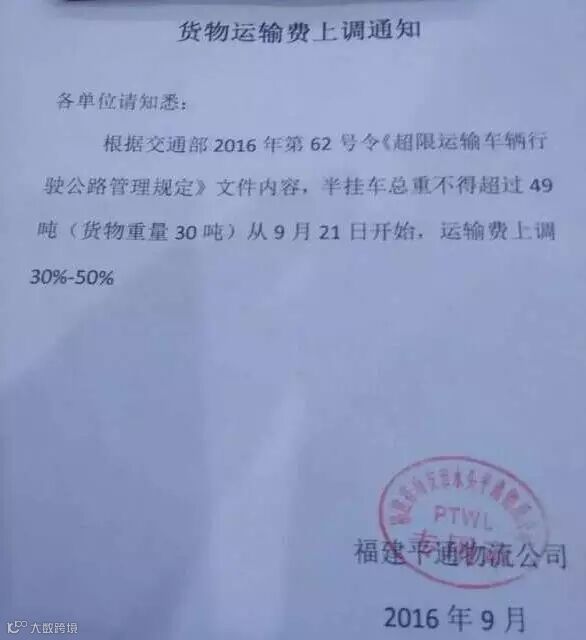 9月21日起公路货运运输运费单价上调33.6%左右