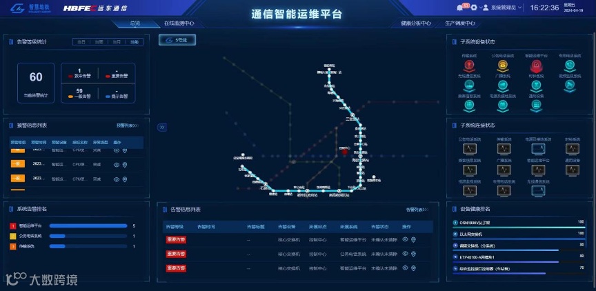 智能运维平台面向通号中心运维人员,可实现对通信系统中的传输、公务电话、专用电话、专用无线、广播、时钟、视频监控、乘客信息、电源等系统的运维工作进行统一管理,提供集中告警、性能监控、智能预警、智能诊断、工单管理、应急预案及移动应用等功能。其以通信关键设施设备为主要管控对象,采用云计算大数据、人工智能等技术,实现关键系统和设备故障自诊断、告警集中检测根因定位、专家系统综合决策、故障预测健康管理,以提高安全服务水平和管理效率,降低劳动强度、技能要求和运维成本。