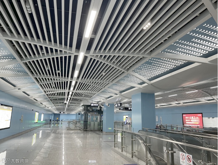 骆驼桥站依托镇海骆驼桥未来社区打造生态和谐的城北活力中心的规划,装修方案紧贴生态宜居的主题,将宁波市树香樟树的自然肌理元素融入到异形冲孔板中,结合全站运河水流风格设计,车站风格设计简洁、大气,富有诗意。