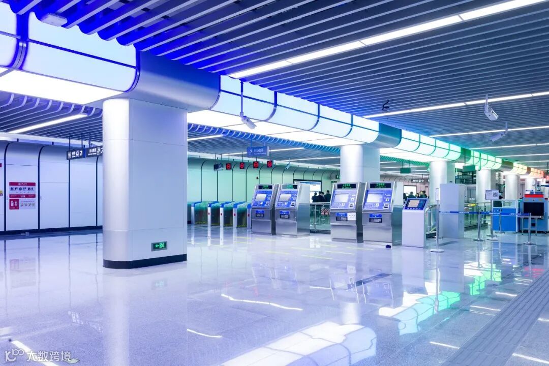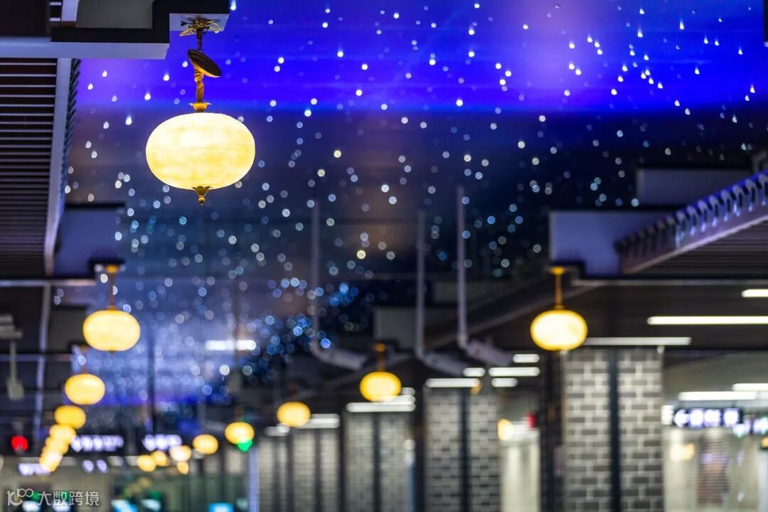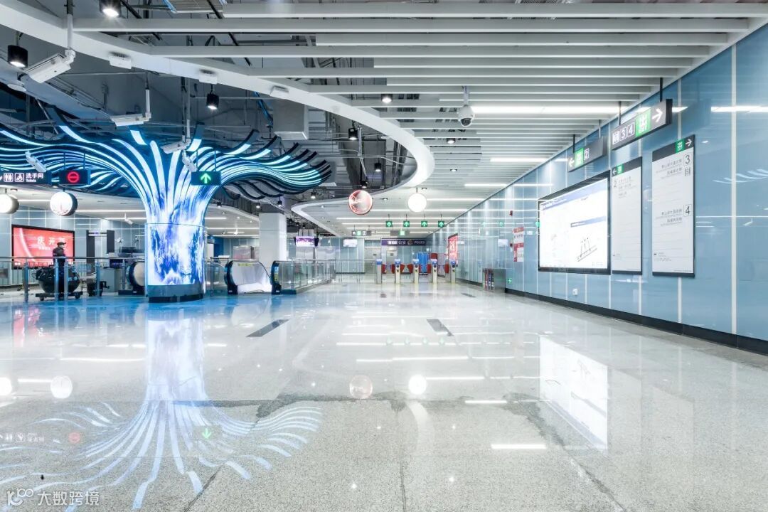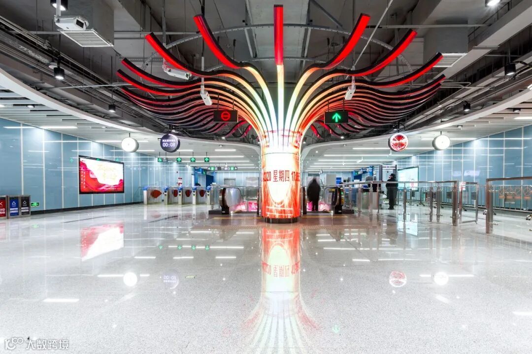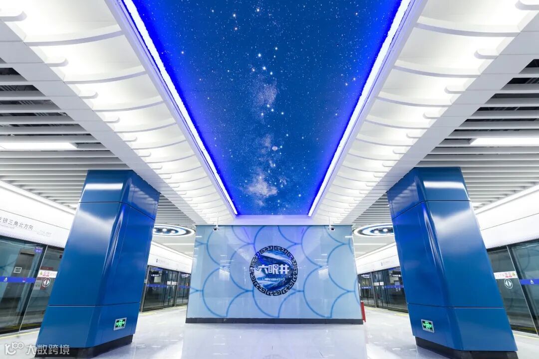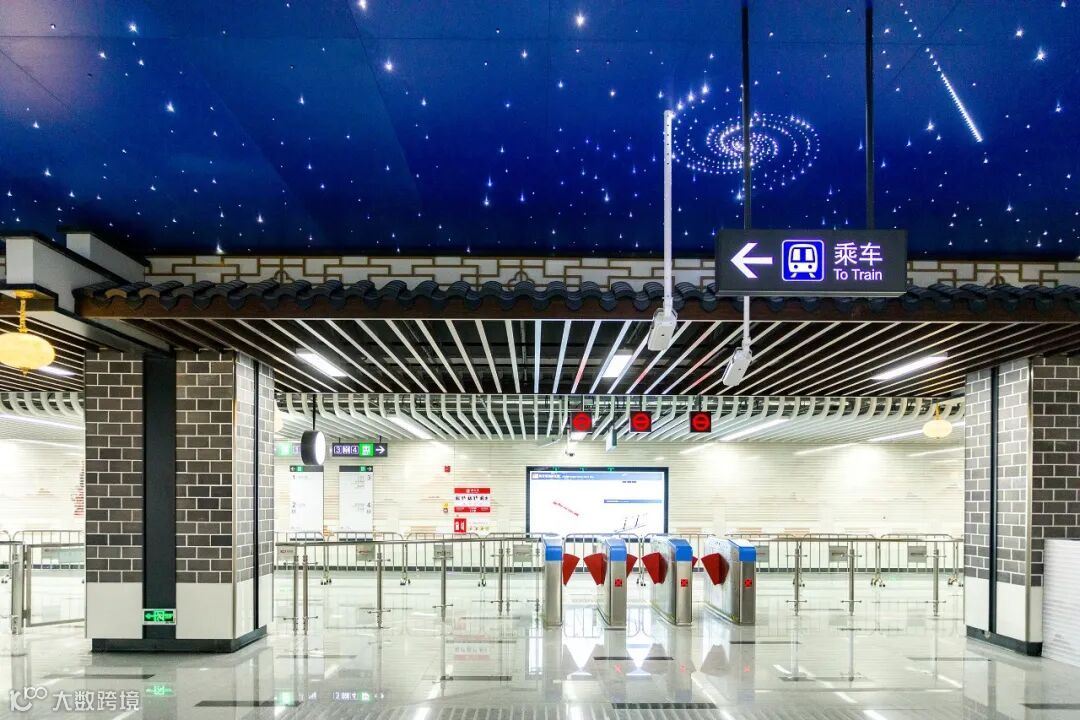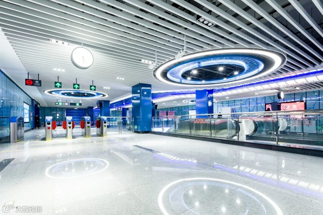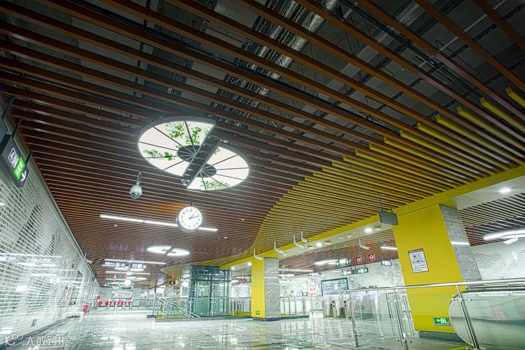 六眼井站设计以“井”的轮廓为设计元素,在天花板布局科技的灯光,打造一个时尚、简约又富有文化气息的站点。