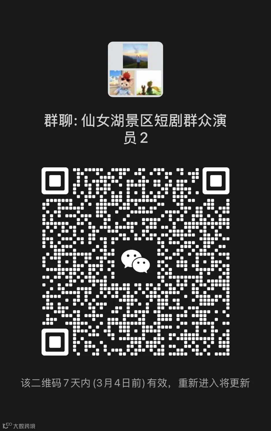 扫描下方二维码加入群聊,即可报名参与仙女湖短剧的拍摄!群内会有工作人员详细解答你的疑问,并通知后续的面试安排。快来扫码加入吧!