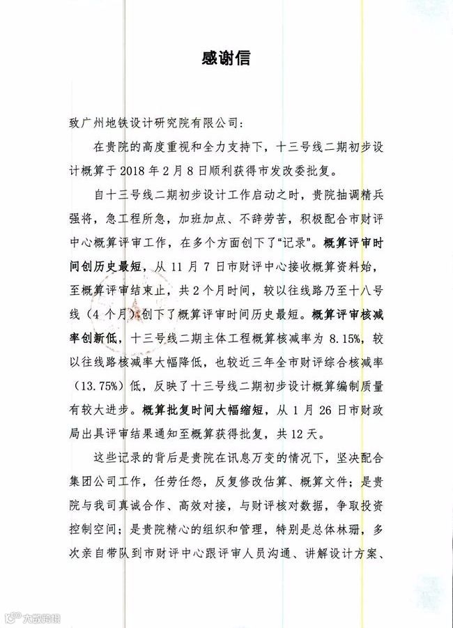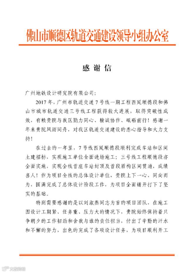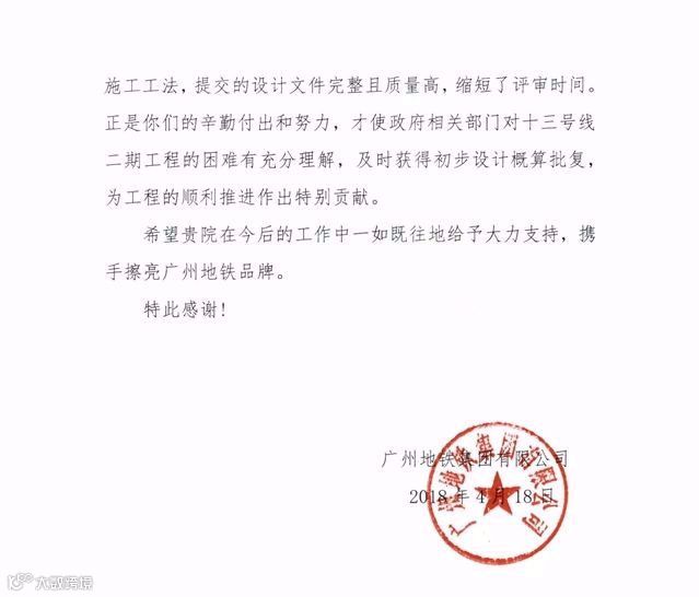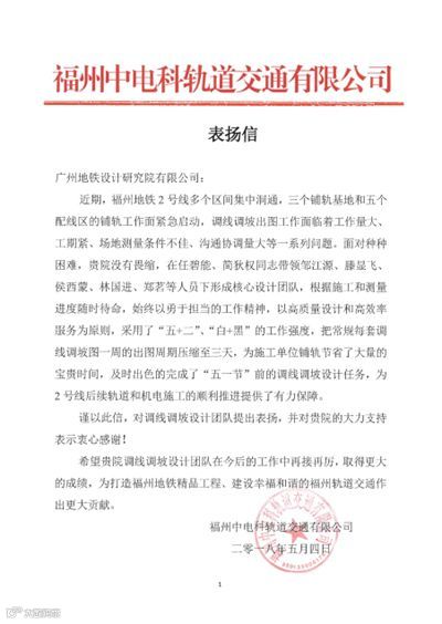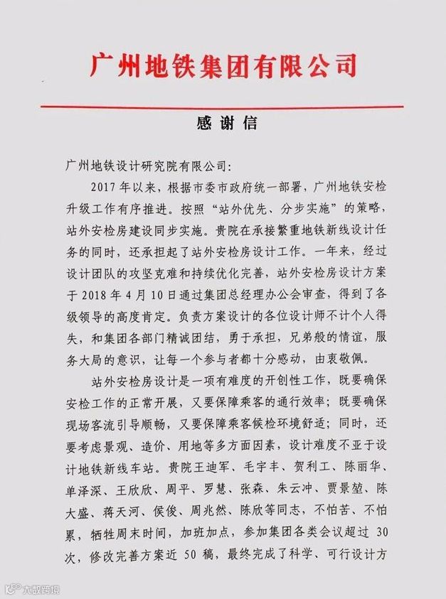 近期,我院陆续收到广州地铁集团、福州地铁、顺德区地铁公司、广东省节能协会等单位发来感谢信,对我院相关设计服务表示高度肯定和感谢。以下是部分感谢信选登:
