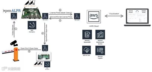 此次演示模拟的是一个自动停车场的应用场景。以 ARMADA 处理器为基础的 Marvell MACCHIATObin® 社区开发板集成了AWS Greengrass®软件,可用作边缘计算节点。Marvell 边缘计算节点会接收放置在停车场入口和出口处两个摄像机的视频流,以 ARMADA 处理器为基础的计算节点会运行 AWS Greengrass 核心;执行两个 Lambda 函数来处理传入的视频流并通过识别牌照辨识进入停车场的车辆;然后检查进入停车场的车辆是否经过授权。