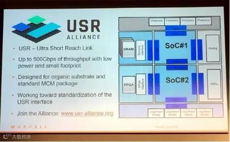 值得关注的是,Marvell在上个月推出了USR Alliance,这里的USR代表Ultra Short Reach link(超短距离连接)。具体来说,随着芯片研发的成本越来越高,Marvell在几年前就提出了模块化芯片设计的概念。“一个大的芯片可以包含多个模块,也就是Die(晶片),不同模块之间需要通过总线连接,USR正是一种超短距连接标准。将模块之间的接口进行标准化后,我们可以跟一些合作伙伴携手一起来为最终客户提供芯片。”