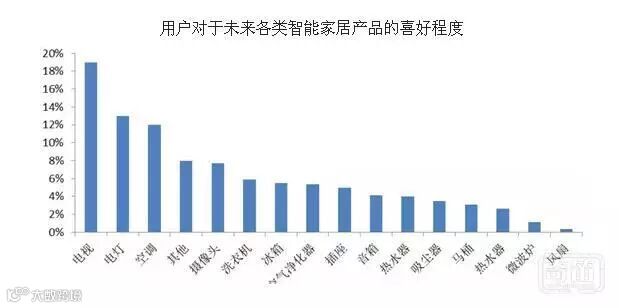 在中国,智能化家电产品则更受欢迎。根据调查显示, 智能电视、 智能电灯、智能空调、智能摄像头、智能洗衣机、智能电冰箱和智能空气净化器成为用户最想购买的几类智能家居产品。由此可见,家电企业将成为中国智能家居市场未来主导者之一。