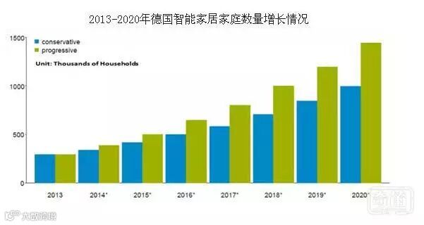 在欧洲方面,智能家居整体渗透率水平偏低,以欧洲前两大经济体德国和法国为例。2014年德国的互联网用户数量接近7200万人,绝对数量在全欧位列第二,仅次于俄国。同时,德国的互联网渗透率接近89%,处于全部欧洲国家的前 30%阵营。虽然拥有良好的互联网基础以及欧洲第一大经济体的消费能力, 但德国智能家居行业发展缓慢。2014年德国使用智能家居的家庭数量约为37万户,同期德国家庭数量约为3760万户,因此2014年德国智能家居渗透率不足1%,处于较低发展水平。