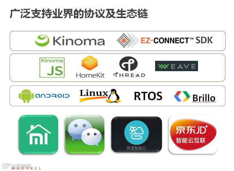 在生态系统方面,Marvell支持目前IoT领域各大主流的协议和生态链: Marvell刚成为全球首家在其IOT平台—MZ300系列上支持谷歌WEAVE协议的芯片厂商;Marvell也是苹果的Homekit阵营的重要合作芯片厂商。在国内,Marvell也囊括了几乎所有的IoT物联网标准和生态链,包括小米、京东、阿里、微信等。