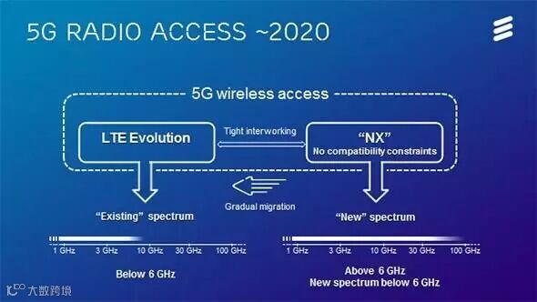 5G将包括LTE演进以及新的无线接入技术,我们在下文将称之为“NX”。LTE演进将专注于增强现有的约6GHz频谱的向后兼容性,而NX将重点关注新频谱,即尚未部署LTE的频谱。尽管在较高频率找到大量连续频谱的难度较小,但低频对于广域覆盖至关重要,NX首次部署很可能针对中级高频。因此,NX将能在从不到1GHz到近100 GHz的范围内运行。