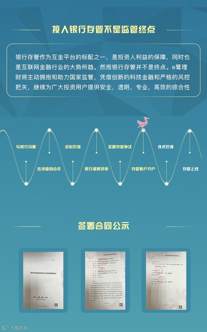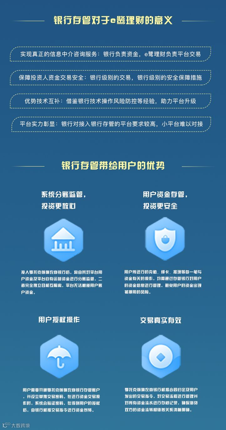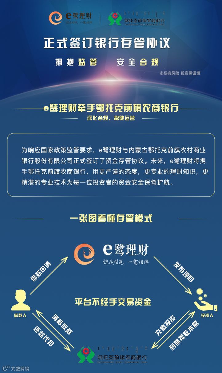 为响应国家政策监管要求,e鹭理财与内蒙古鄂托克前旗农村商业银行股份有限公司正式签订了资金存管协议。未来,e鹭理财将携手鄂托克前旗农商银行,用更严谨的态度,更专业的理财知识,更精湛的专业技术为每一位投资者的资金安全保驾护航。