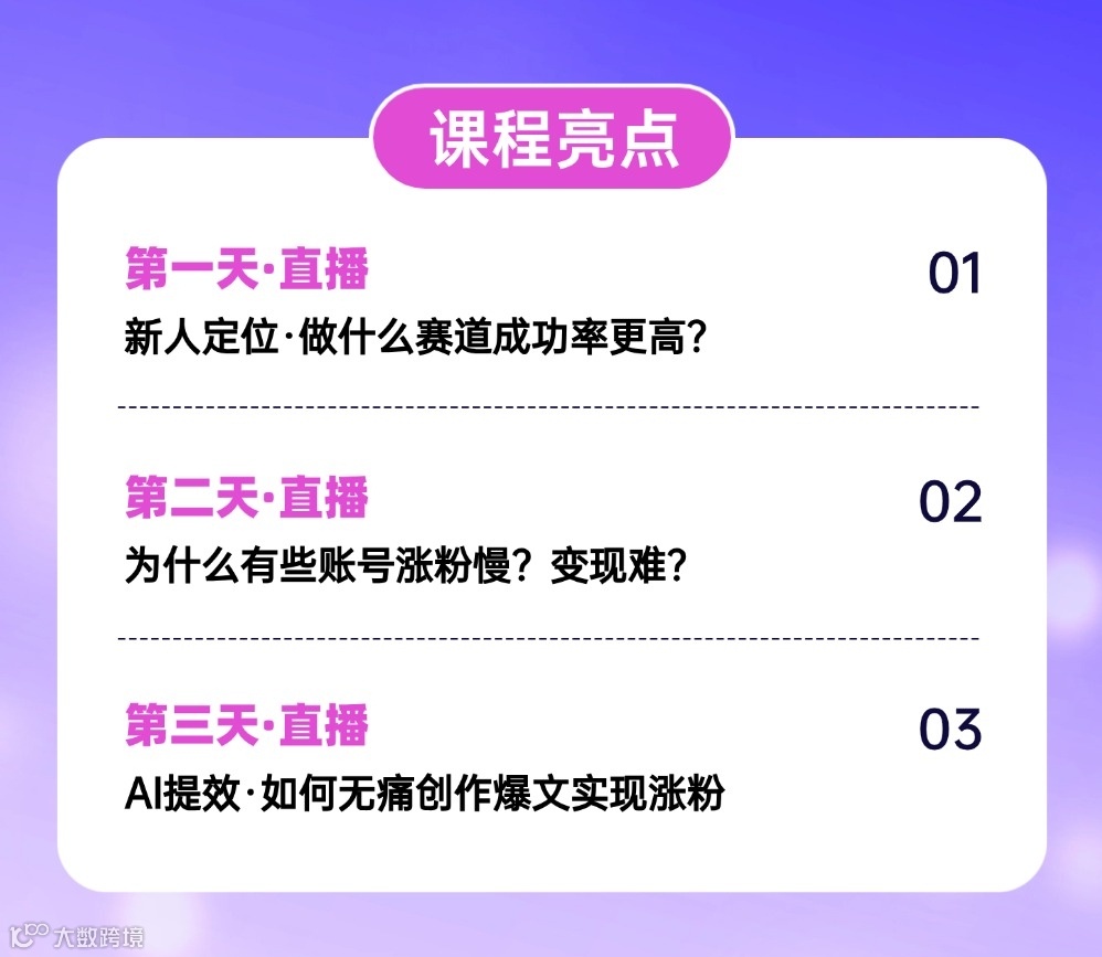 拍👇3天运营美学营体验课程,解锁哪些赛道更容易成功、拆解涨粉慢变现难的原因,教你用 AI 提效、轻松起号。