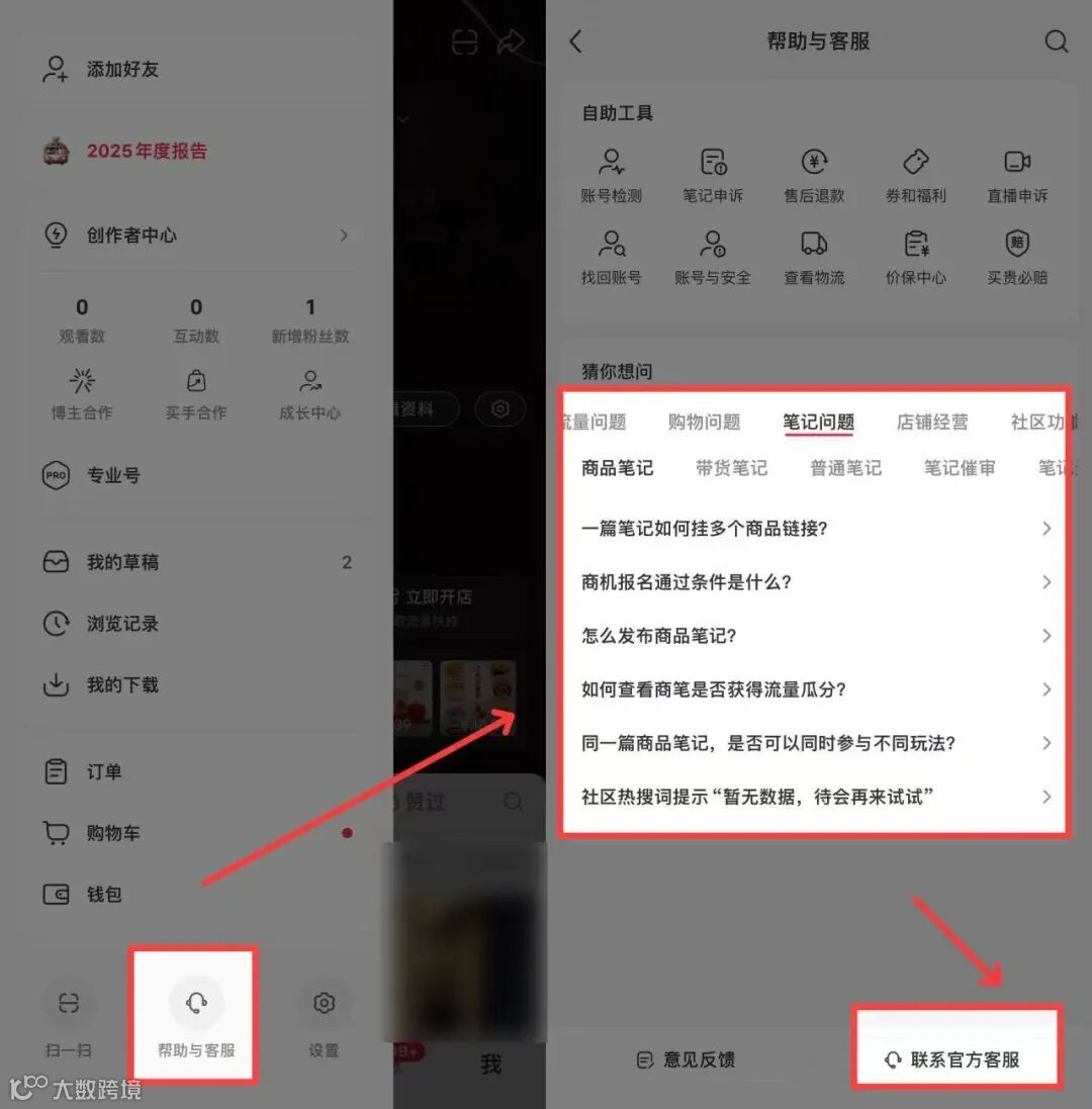 可以在小红书“我的”页面,左上角“三”,点击最下方的“帮助与客服”,找到“笔记问题”,点击“联系官方客服”,针对对应问题找到客服进行申诉(这里一点要多发几次“人工服务”,一直到触发人工服务的窗口)