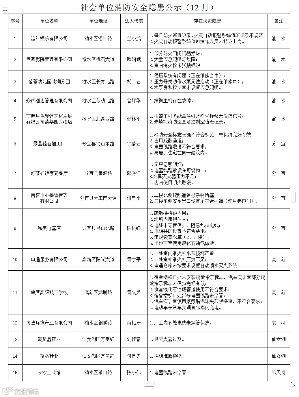 火灾隐患,犹如一颗“定时炸弹”,稍有不慎,极易引发火灾,严重威胁人民群众生命财产安全。为全力维护社会面消防安全形势稳定,切实增强社会单位及公众消防安全意识,营造良好的消防安全氛围。新余市消防救援支队积极开展火灾隐患曝光行动,对存在风险隐患的重点单位、各类消防安全不良行为开展曝光,通过舆论监督,形成全社会共同参与火灾防治,提升全民消防安全素质。