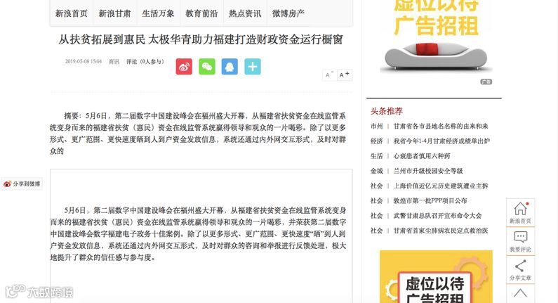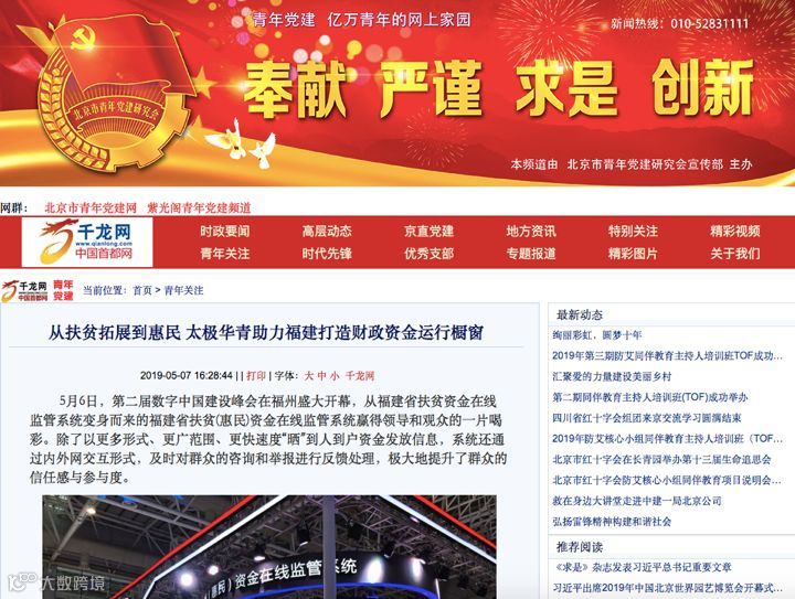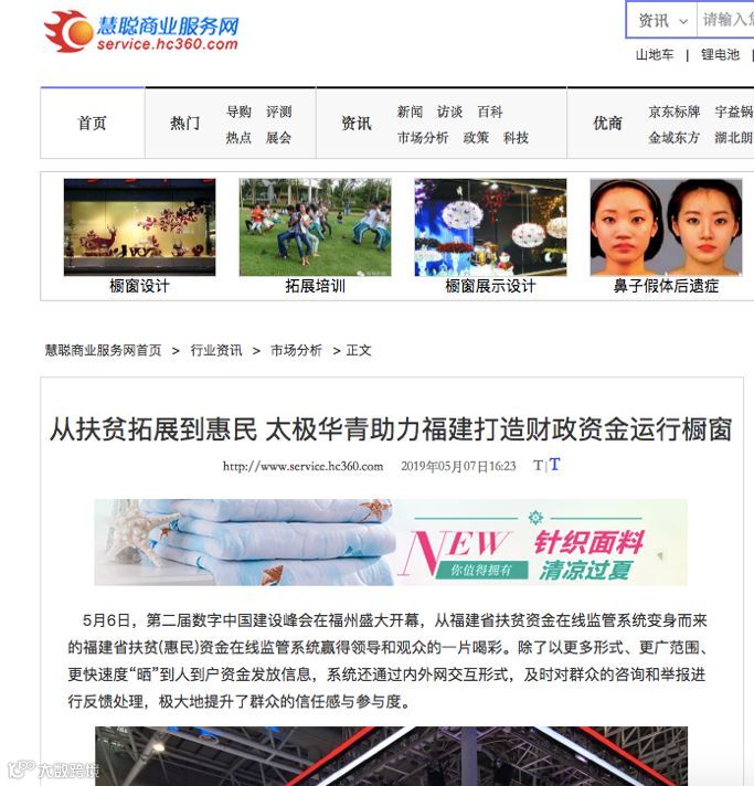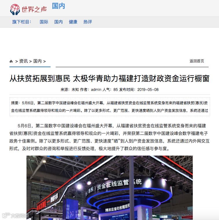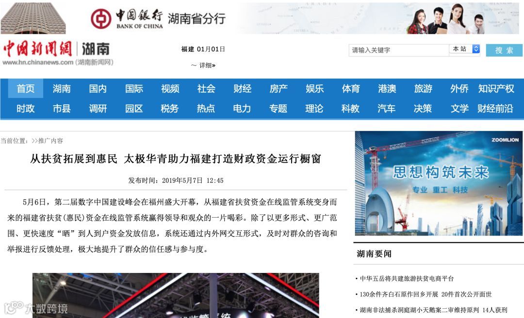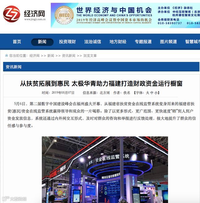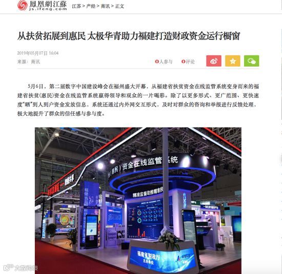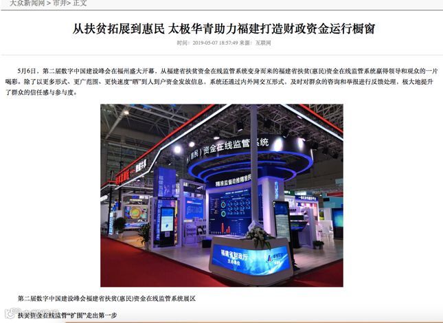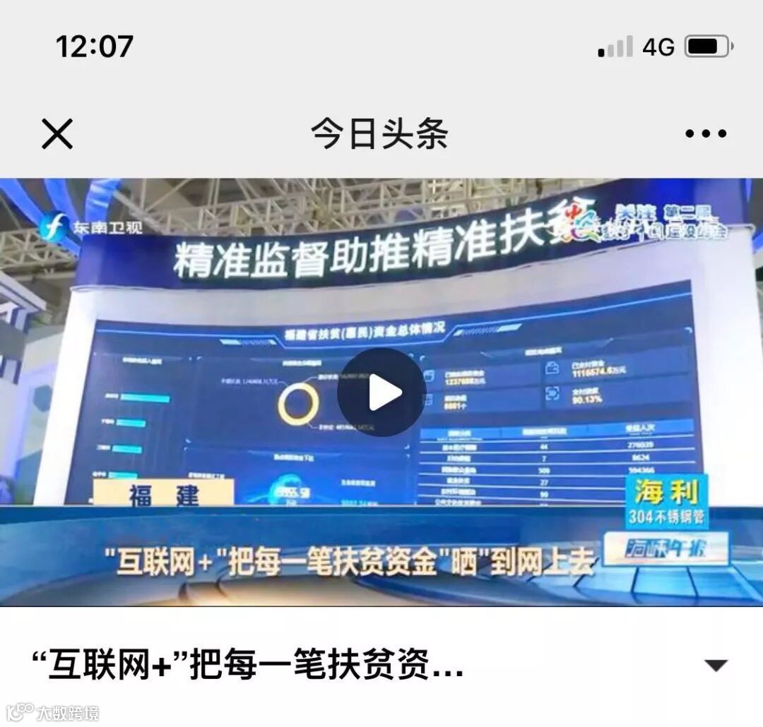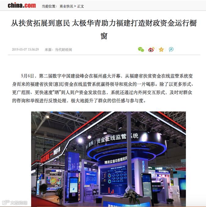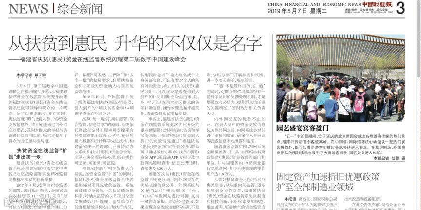 第二届数字中国建设峰会圆满落下帷幕,期间福建省扶贫(惠民)资金在线监管系统得到各级领导的关注,吸引广大群众争相体验,并成为各大媒体报道的“宠儿”,包括东南卫视、中国财经报、腾讯、新浪、搜狐、网易、凤凰网、今日头条、慧聪网、中国网、中华网、中新网、千龙网、北方网、经济网、大众新闻网、新化月报、中国商业周刊、IT搜购、中国焦点资讯、中国经济发展、中国南方新闻网、世界之声、每日环球等30多家媒体。