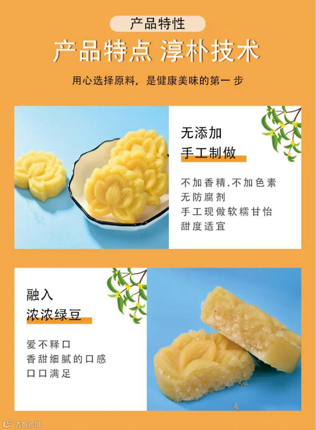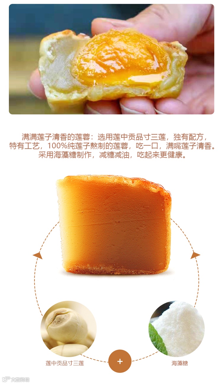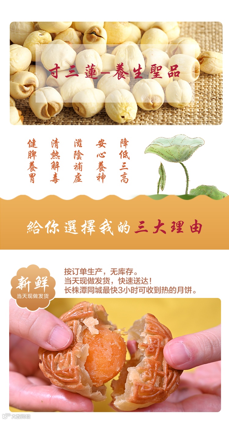 选材也非常用心 接单后现做发货,无防腐添加,新鲜原材料 采用优质小麦研磨成粉 制作莲蓉蛋黄月饼的莲蓉原料选用的是湘莲中的极品“寸三莲”,自古就是贡品,三颗莲子就有一寸长粉质细、香,用其做出来的莲蓉柔、滑~