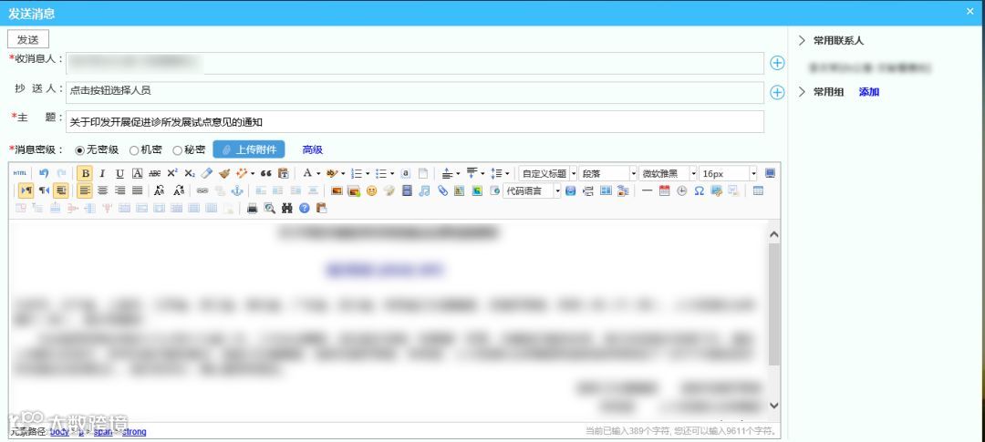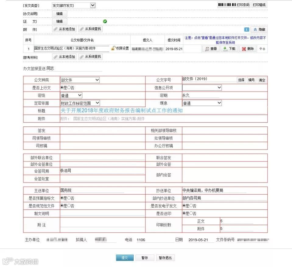 在起草发文时,系统根据所需要外部会签单位的多少及文件的标题、文号等要素自动同步至发文正文中,系统按照对应的正文模板生成正文的相关信息,生成报批清样模板。