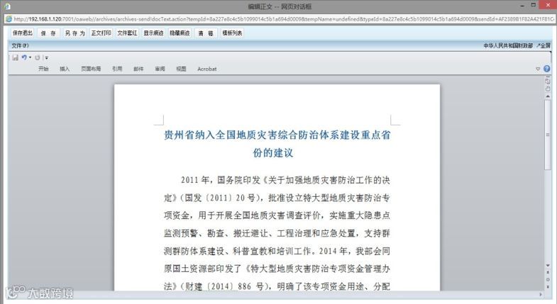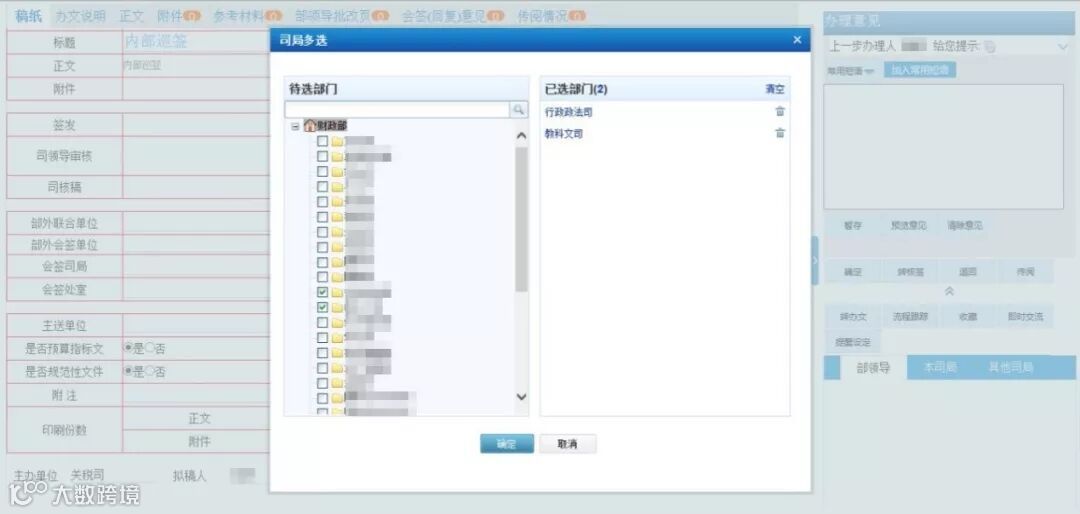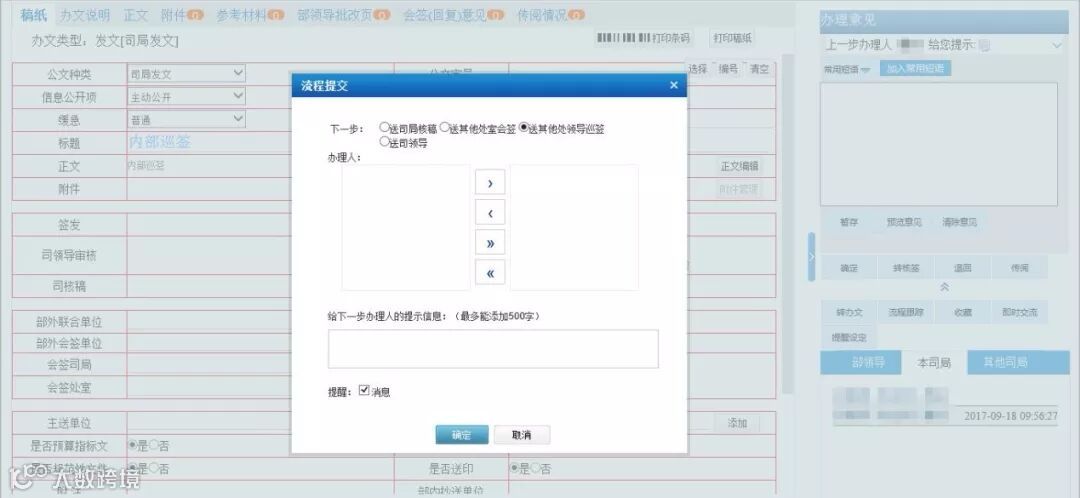 发文会签有多种方式:巡签、内部会签、同等部门间会签,并能设置会签回复意见的时限,系统能根据不同的时限,有不同的提示;如果协办部门未能在规定的时间内办理,主办部门可直接干预协办部门处理意见,并能将干预的备注情况,通知协办部门。