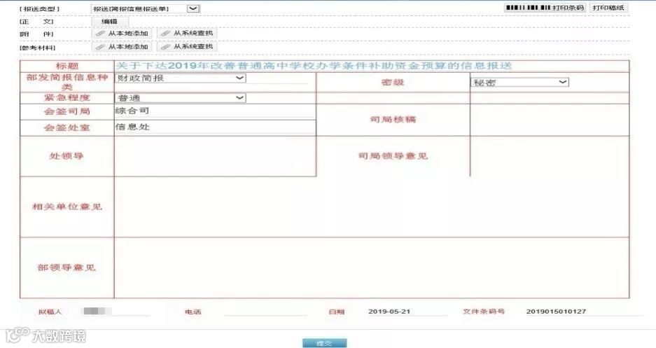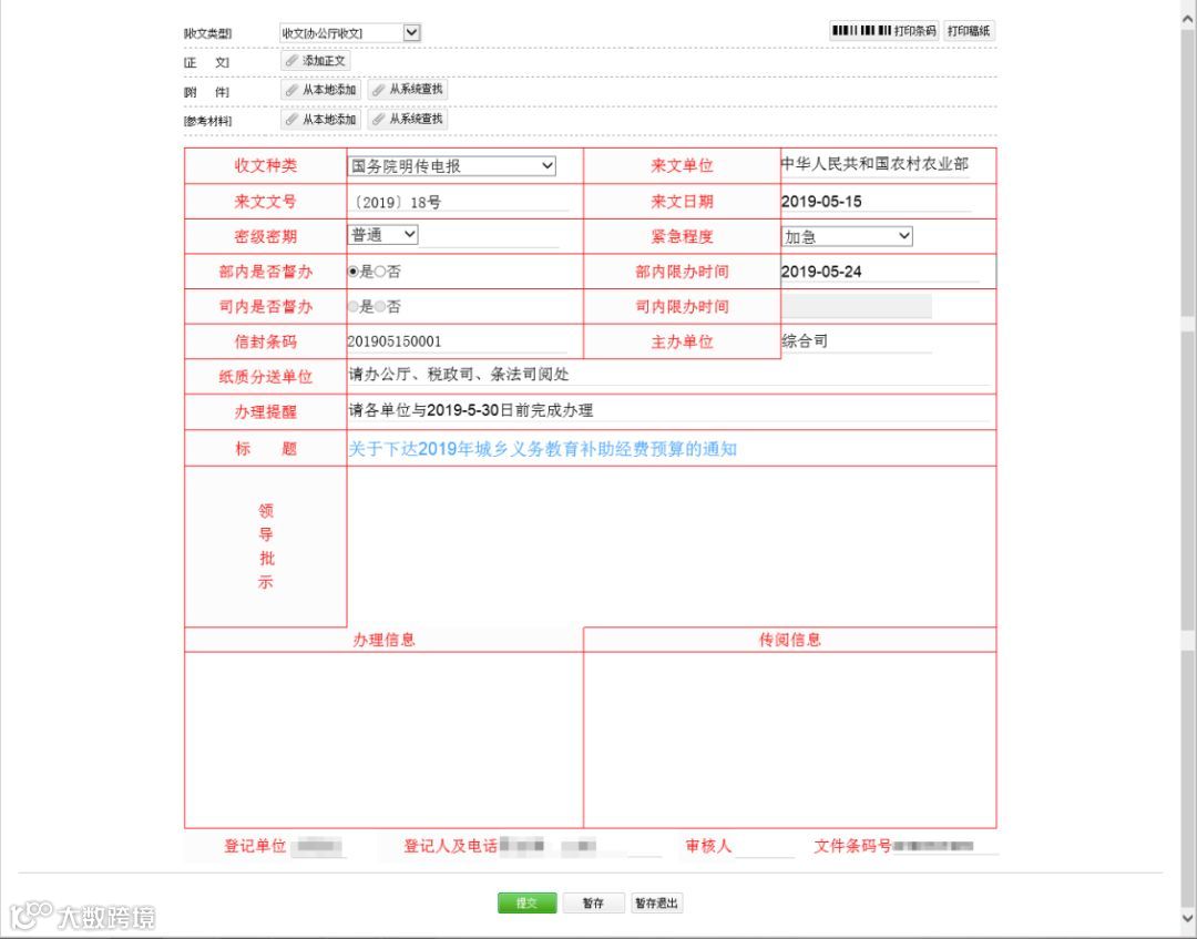收到外部纸质来文,将纸质文件扫描生成电子文件,能无缝对接至系统,方便阅批及查阅,无需人员来回送达传阅,方便、快捷、高效;通过扫描枪扫描信件二维码,能直接将公文的基本要素读取至系统的相关栏目内,免去复杂的信息登录操作;公文处理过程中通过一键快捷操作,即转办文或转办件功能按钮,能直接转收文或发文,并自动将原文件作为新文件的参考材料或附件,免去了手动查找及关联的操作。