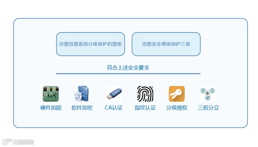 此外,平台符合分保机密级、等保三级的安全要求,采取了安全域划分、密级管理、访问控制、三员分立(即系统管理员、保密管理员、安全审计员)、日志管理、重鉴别和防入侵等安全设计,支持硬件加固、数据加密、CA认证、生理特征强身份认证(指纹)等安全手段。