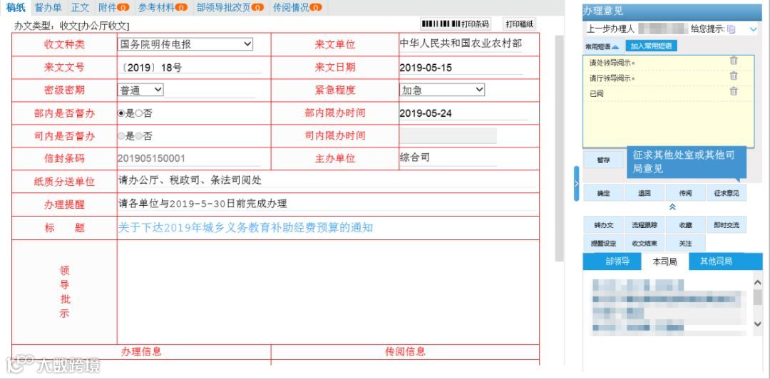 系统提供13种领导签字意见显示方式,可显示部门、人名、时间、意见等等,适应了不同层级领导办文的要求;由于领导业务繁忙,有些工作不能亲自处理,系统提供了代录的功能,即将领导的签批意见代录至系统相应的栏目内,代录意见显示方案为12种;代录后,稿纸中显示为正常的领导签批意见。