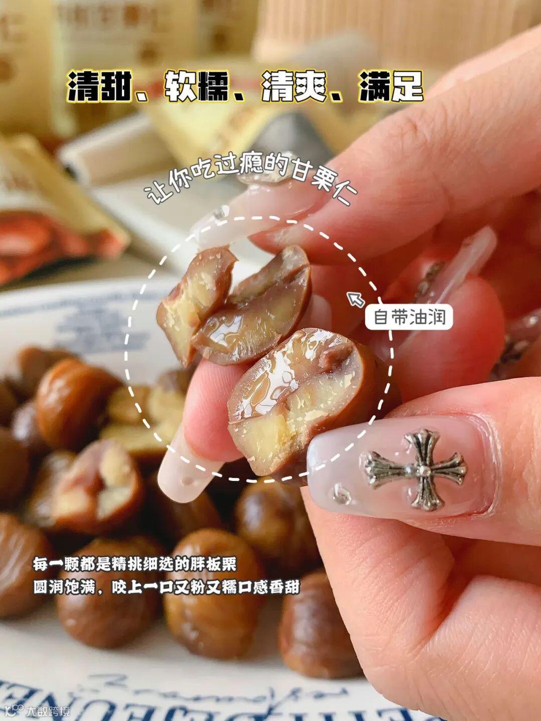 一袋7-9颗刚刚好的颗数🤚 吃太多怕腻吃太少怕不够规定好的数量 让你吃的刚刚好配料表干干净净✨ 没有任何添加‼️ 纯板栗加工原汁原味