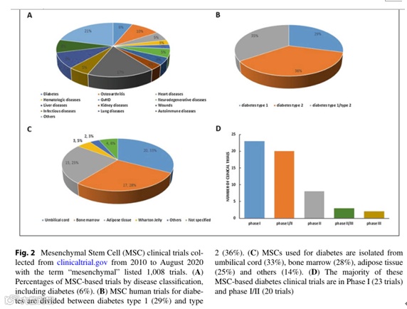 在过去的10年中,有几十项MSCs治疗糖尿病临床试验登记注册,占所有试验的6%(如下图所示)。其中大多数(51项)处于早期阶段(I期、I/II期或II期)。只有很少的第三阶段试验已经完成或正在进行。